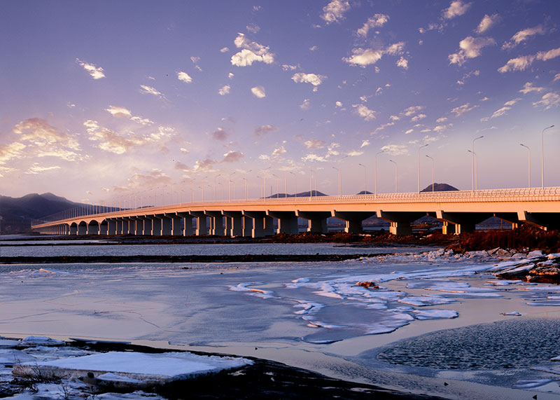 大橋工程分為主橋、預(yù)制段引橋和北側(cè)現(xiàn)澆段引橋,其中主橋長500米,主跨為120米的大跨變截面預(yù)應(yīng)力混凝土連續(xù)箱梁,是當(dāng)時東北地區(qū)跨度最大的連續(xù)梁跨海橋。大橋的設(shè)計結(jié)合了使用和景觀的雙重功能,作為普灣經(jīng)濟(jì)區(qū)核心位置的地標(biāo)性景觀,獨具特色的夜景設(shè)計使其成為經(jīng)濟(jì)區(qū)一道亮麗的風(fēng)景線。